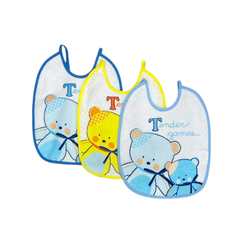 set 6 pezzi bavaglini in spugna stampata con retro in plastica, chiusura con laccetti, la confezione contiene 2X variante, ref. 9066M