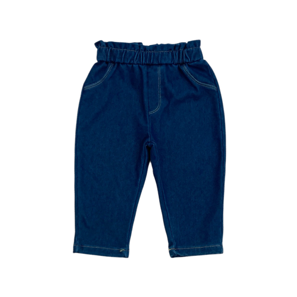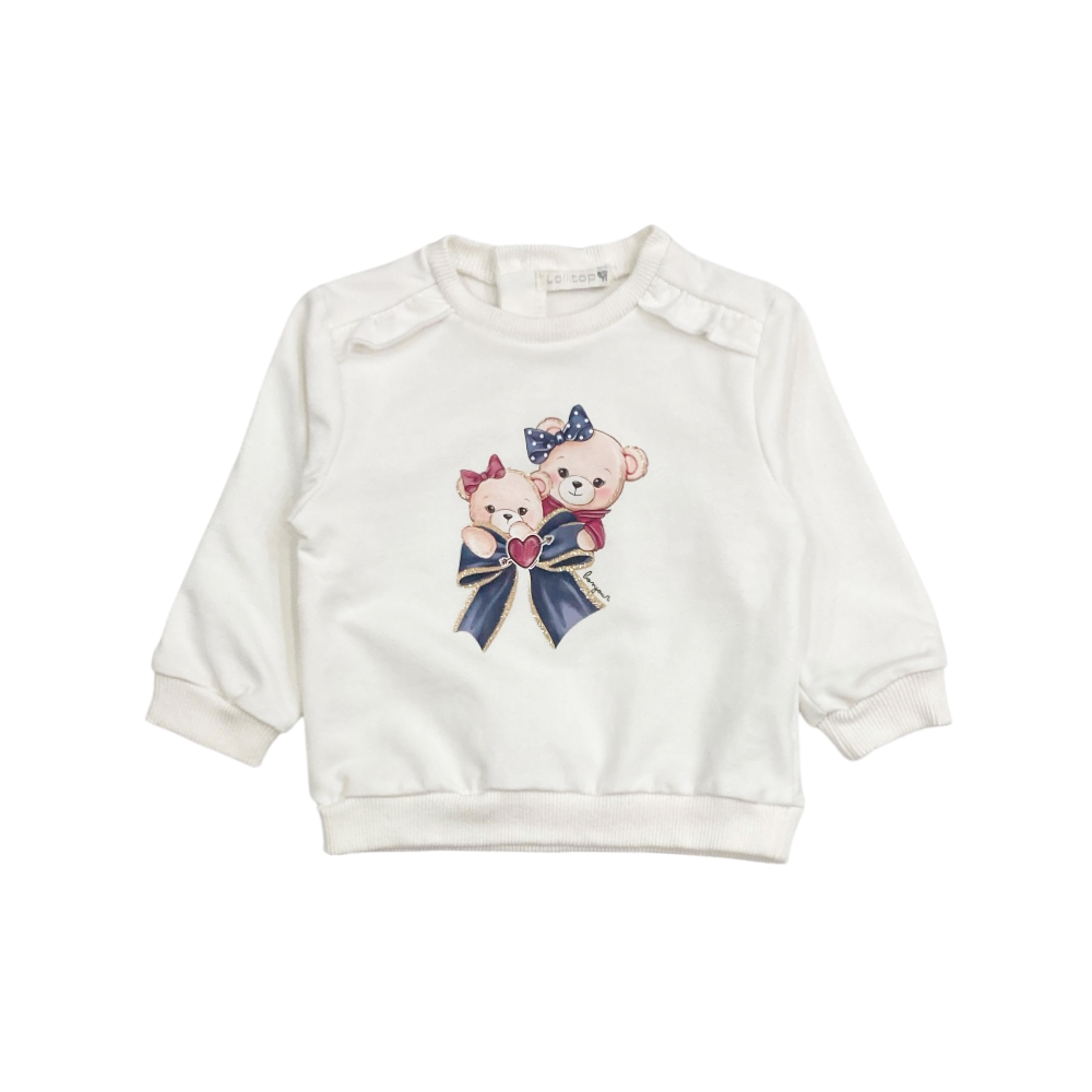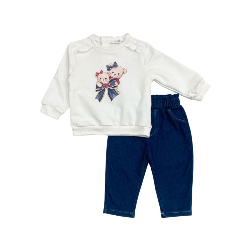 completo bambina 2 pezzi invernale, felpa girocollo con apertura sul retro con 2 bottoncini stampa sul davanti e rouches alle spalle, morbido jeans stretch tutto elastico in vita leggermente felpato, ref. B-571