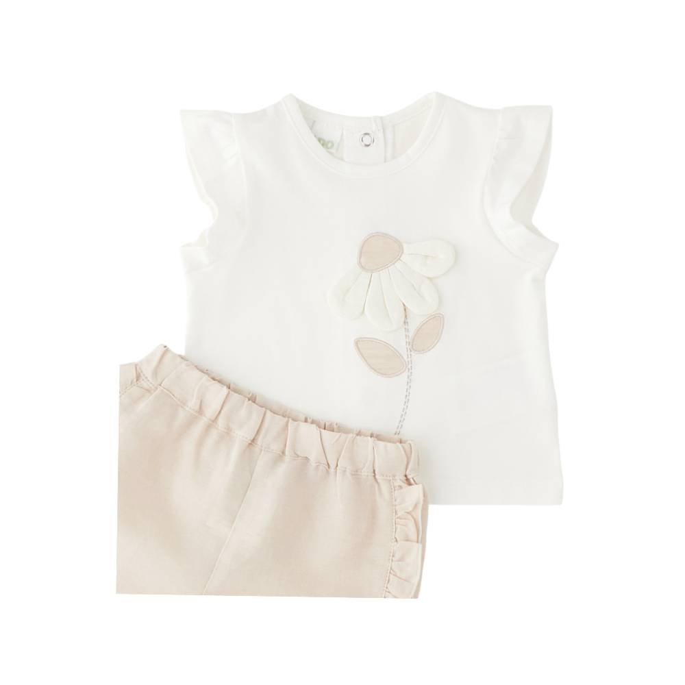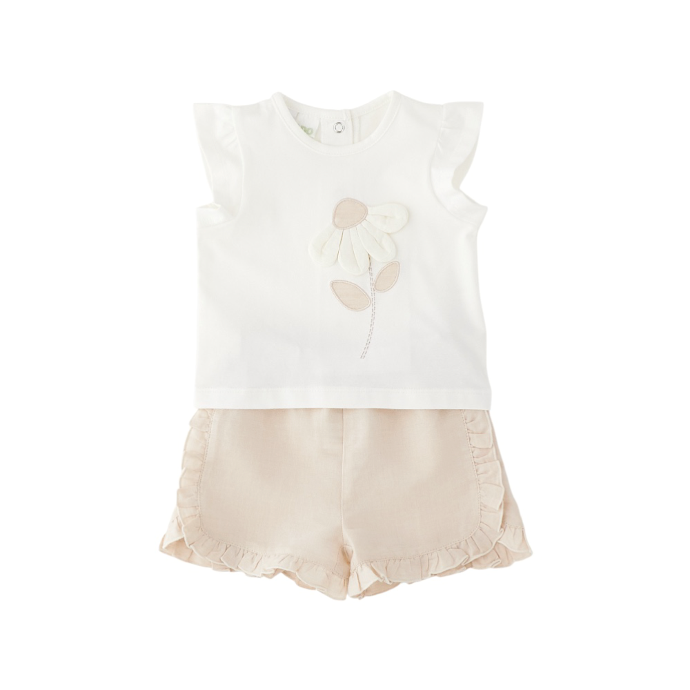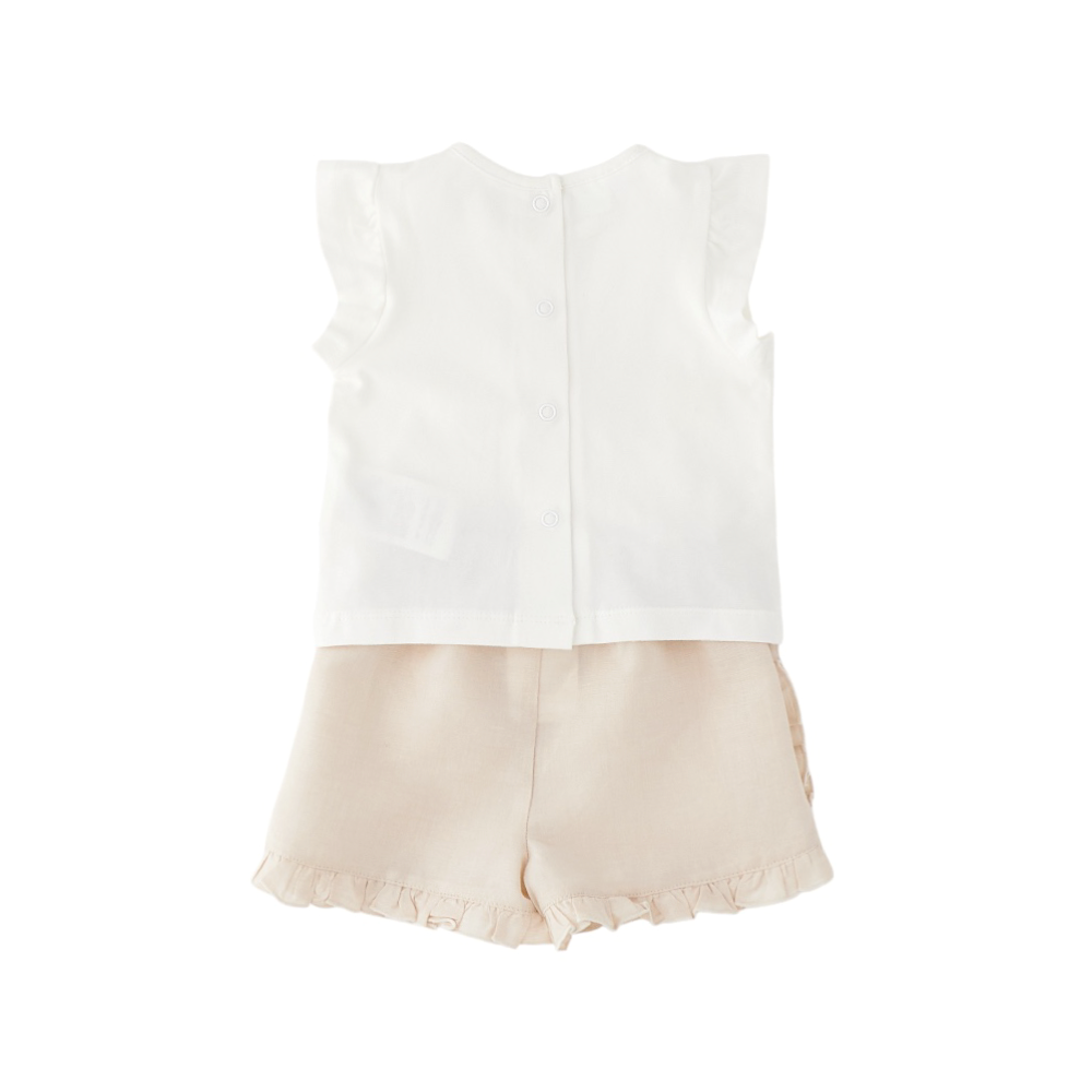 completo corto bambina 2 pezzi, t-shirt in jersey giromanica con ricamo e applicazione sul davanti, apertura sul retro con bottoncini a pressione, short tutto elastico in vita in lino e cotone con rouches ai fianchi e agli orli, 4G212
