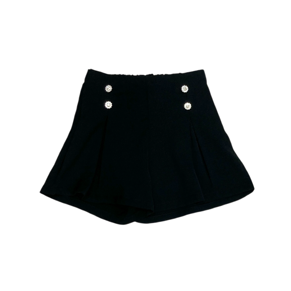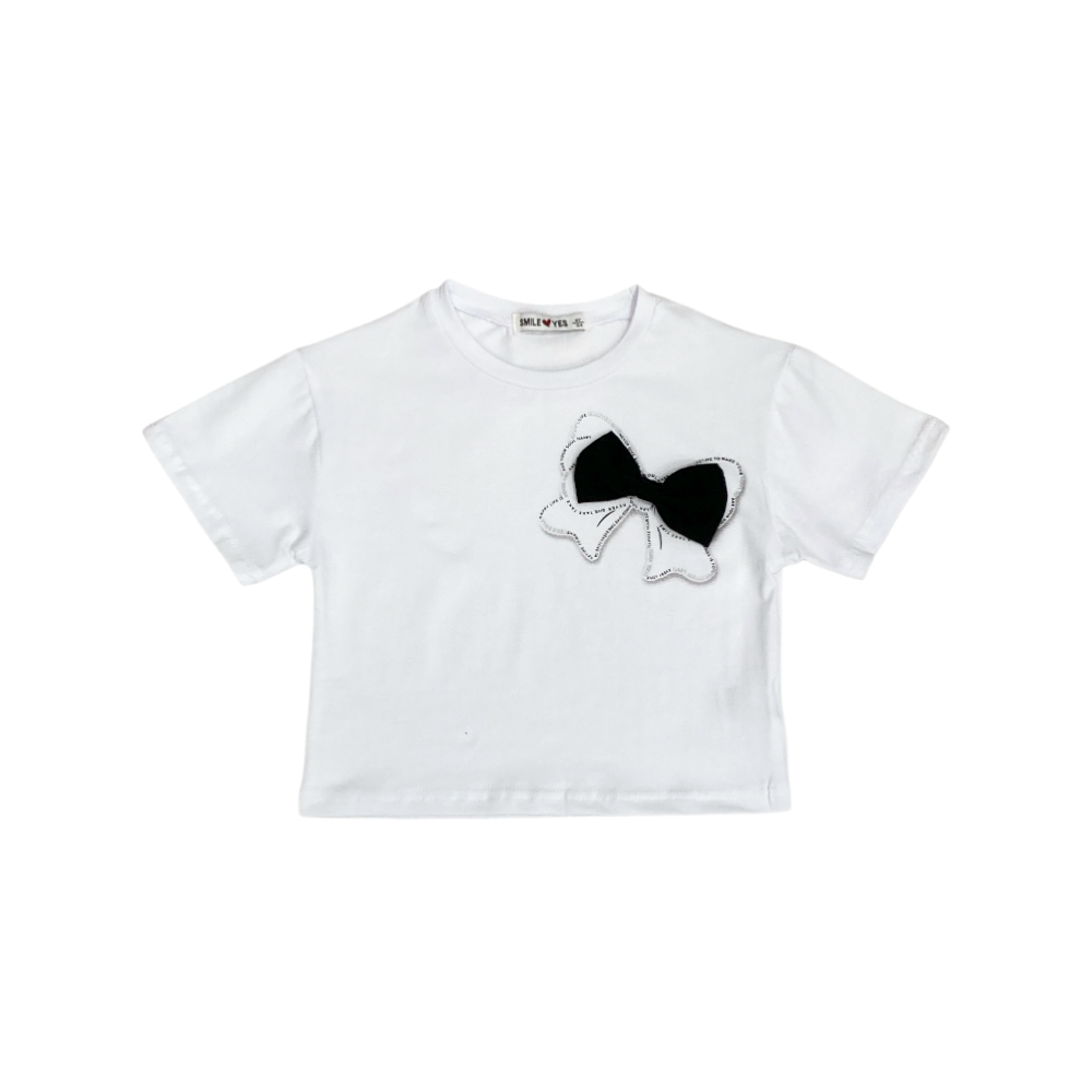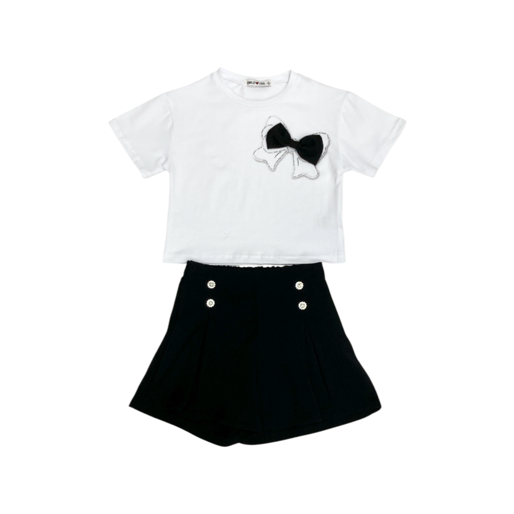 completo corto bambina 2 pezzi, t-shirt in jersey con stampa e fiocco in tessuto applicato, short  ampio in tessuto crepe con pieghe baciate e bottoncini gioiello applicati sul davanti, elastico fisso sul retro, ref. CBA5156