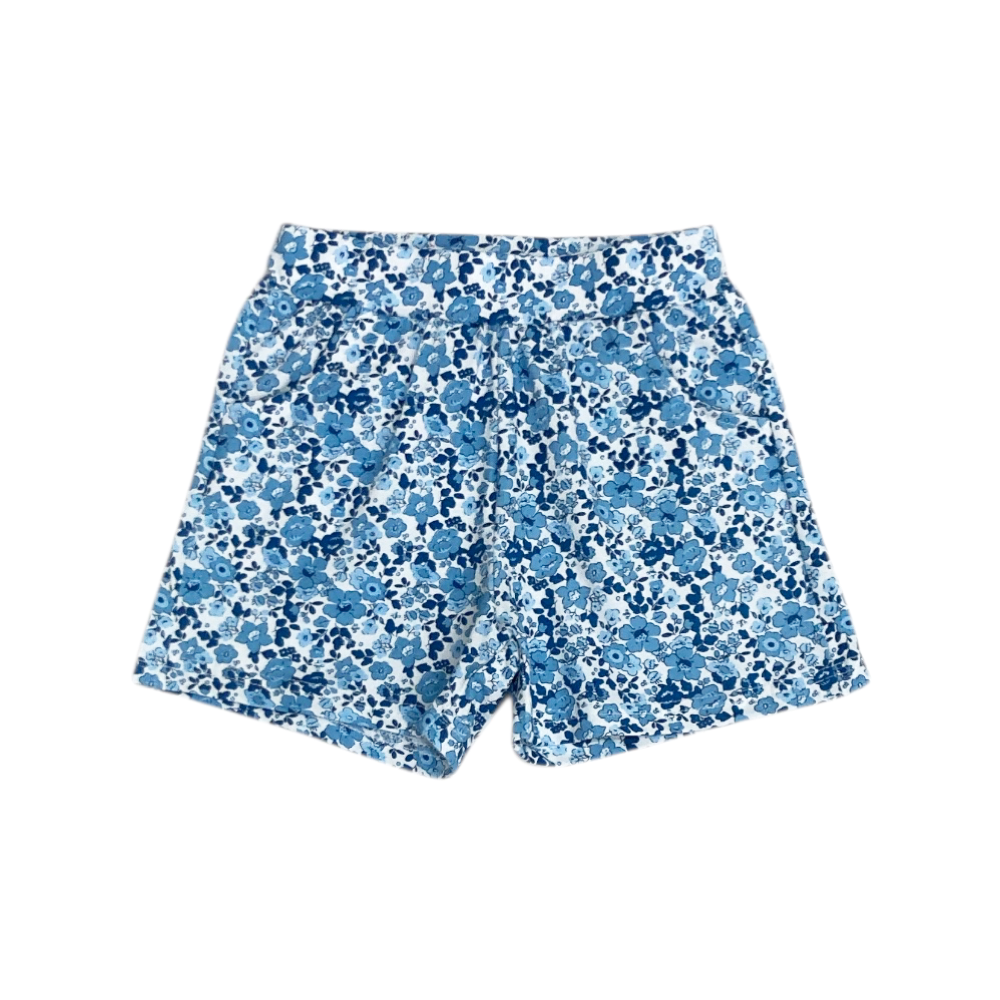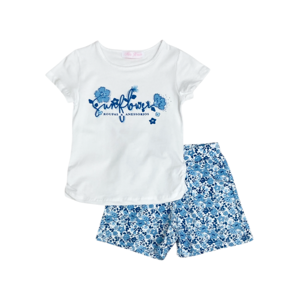 completo corto corto bambina in cotone jersey, t-shirt arricciata ai fianchi con stampa e brillantini sul davanti, short in jersey fantasia fiori con tasche frontali, ref. ZYF-137