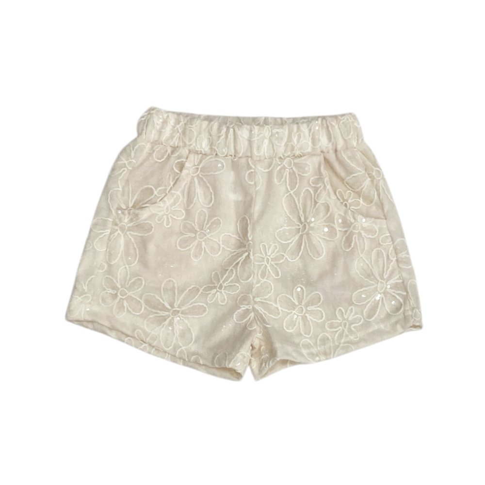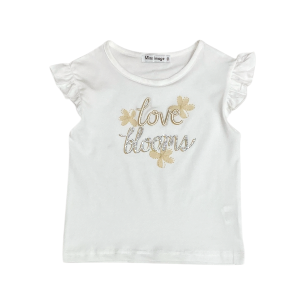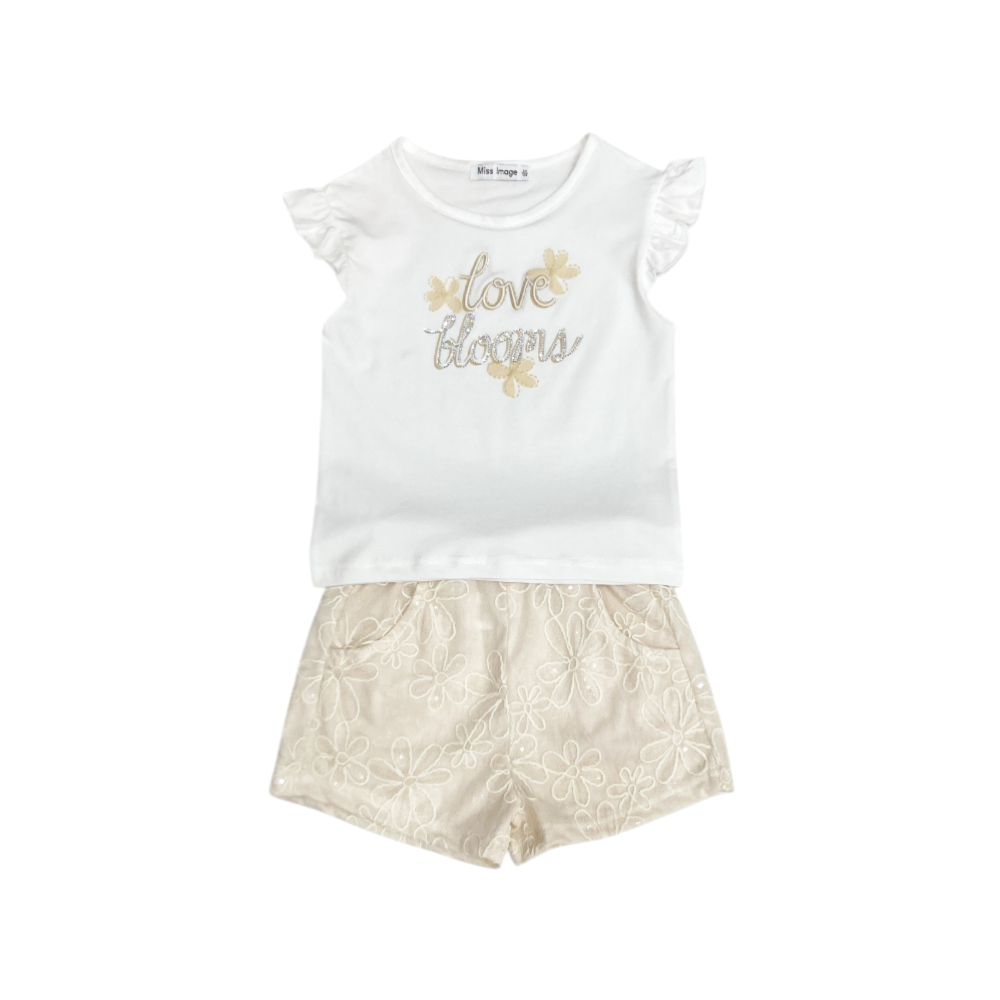 completo corto 2 pezzi, t-shirt in jersey con stampa e brillantini sul davanti e rouches alle maniche, short tutto elastico in vita in tulle ricamato + paillettes con fodera in jersey, tasche frontali, ref. LF-2090