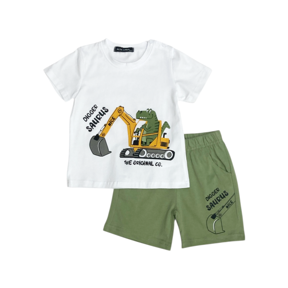 completo corto bambino in cotone jersey, t-shirt con stampa sul davanti e apertura sulla spalla nelle tg. 12-18- e 24 mesi, bermuda coordinato in jersey con tasche frontali, ref. XNO-2323