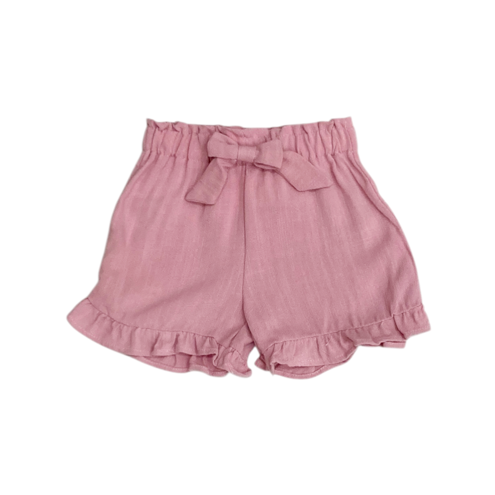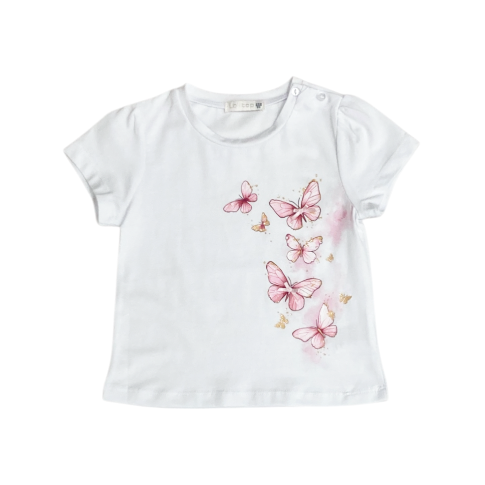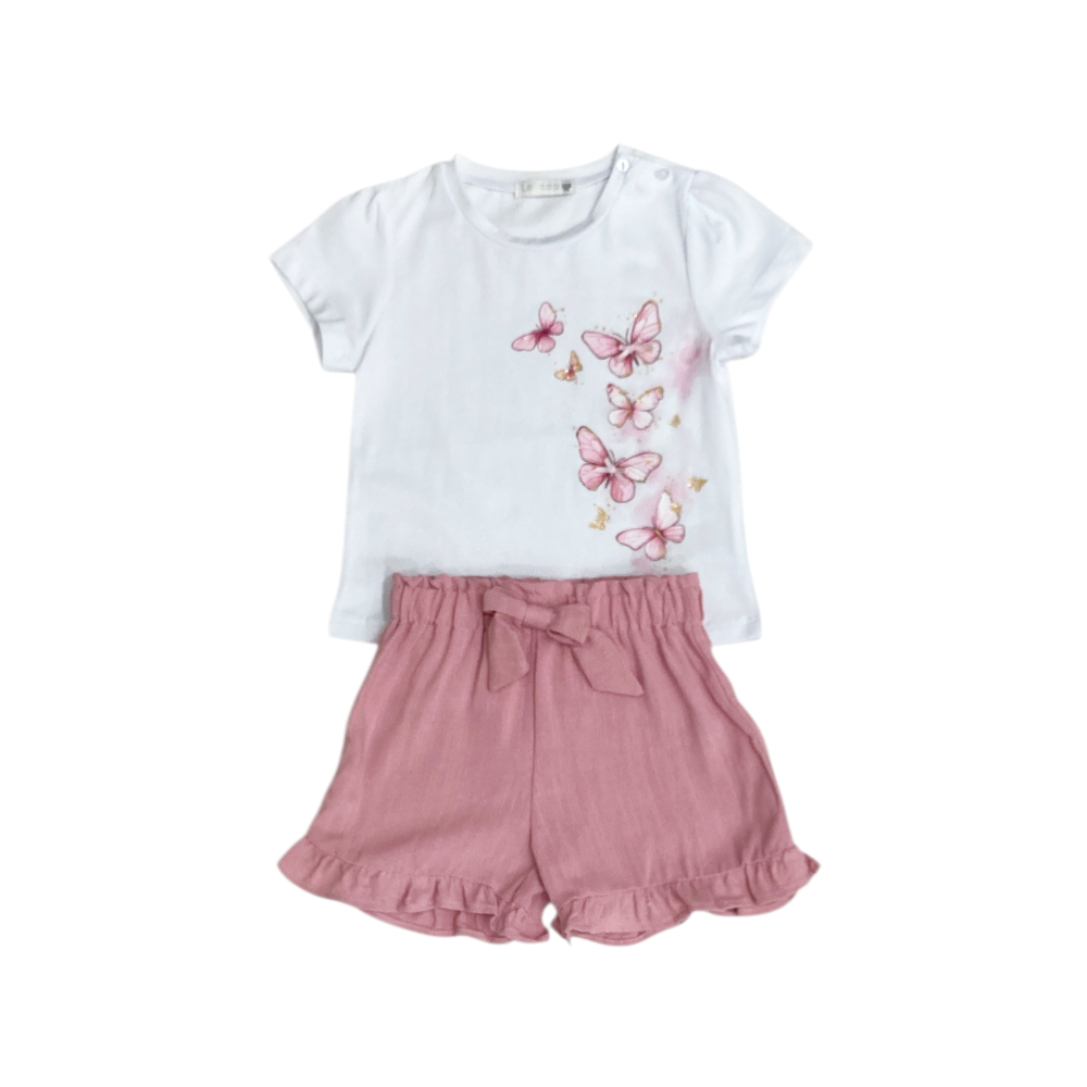 completo corto 2 pezzi, t-shirt in jersey con stampa rafalle e fiocchetti sul davanti, apertura sulla spalla nelle tg. 12-18- e 24 mesi, short in tessuto crepe tutto elastico in vita con fiocco cucito, ref. BS-0771