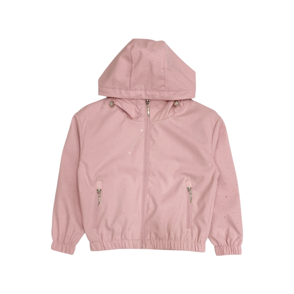 giacca a vento primaverile con cappuccio e brillantini all over, fodera interna e cappuccio in jersey, fodera maniche liscia, tasche frontali, elastico ai polsi e bordo, vestibilità over, ref. GRA5356
