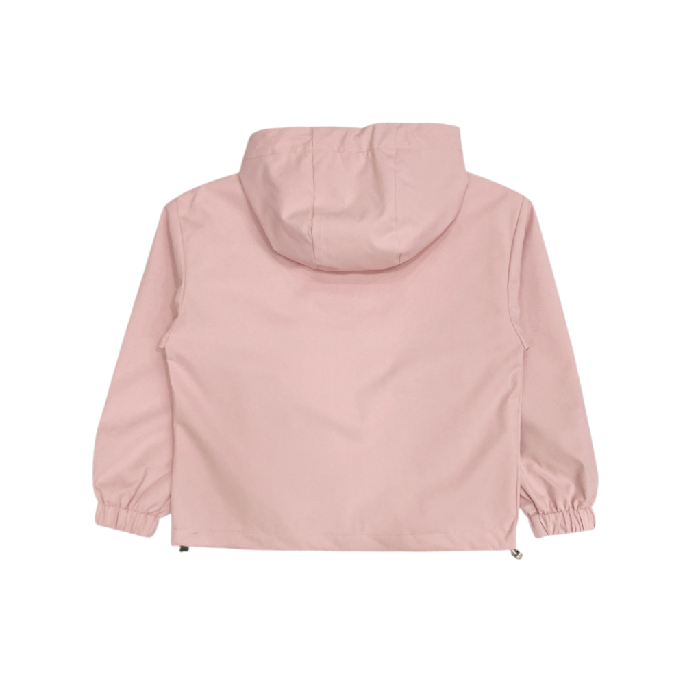 giacca a vento bambina con cappuccio, tasche frontali con zip, fodera interna in jersey, fodera maniche liscia, cordino elastico al bordo e cappuccio con blocca-cordino, vestibilità over, ref. GRA5355
