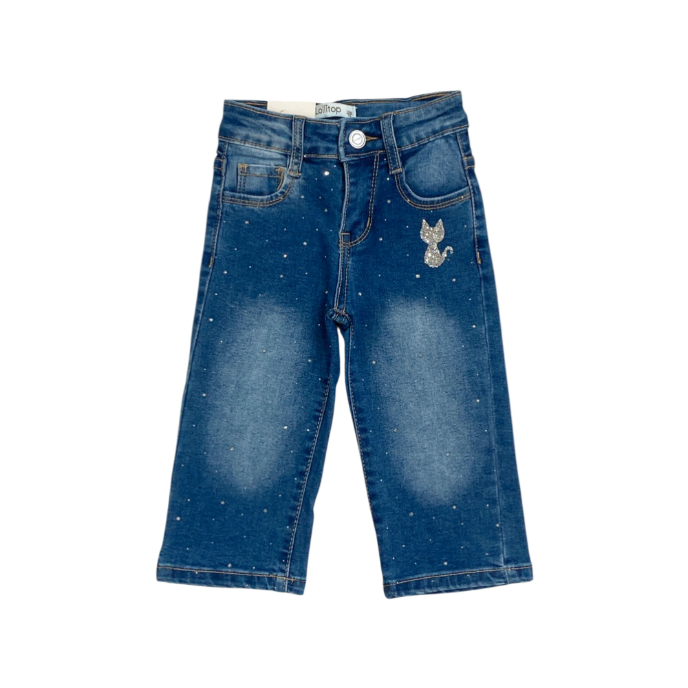 jeans bambina modello 5 tasche a palazzo con brillantini applicati sul davanti, elastico regolabile in vita, stone washed, ref. N-7081