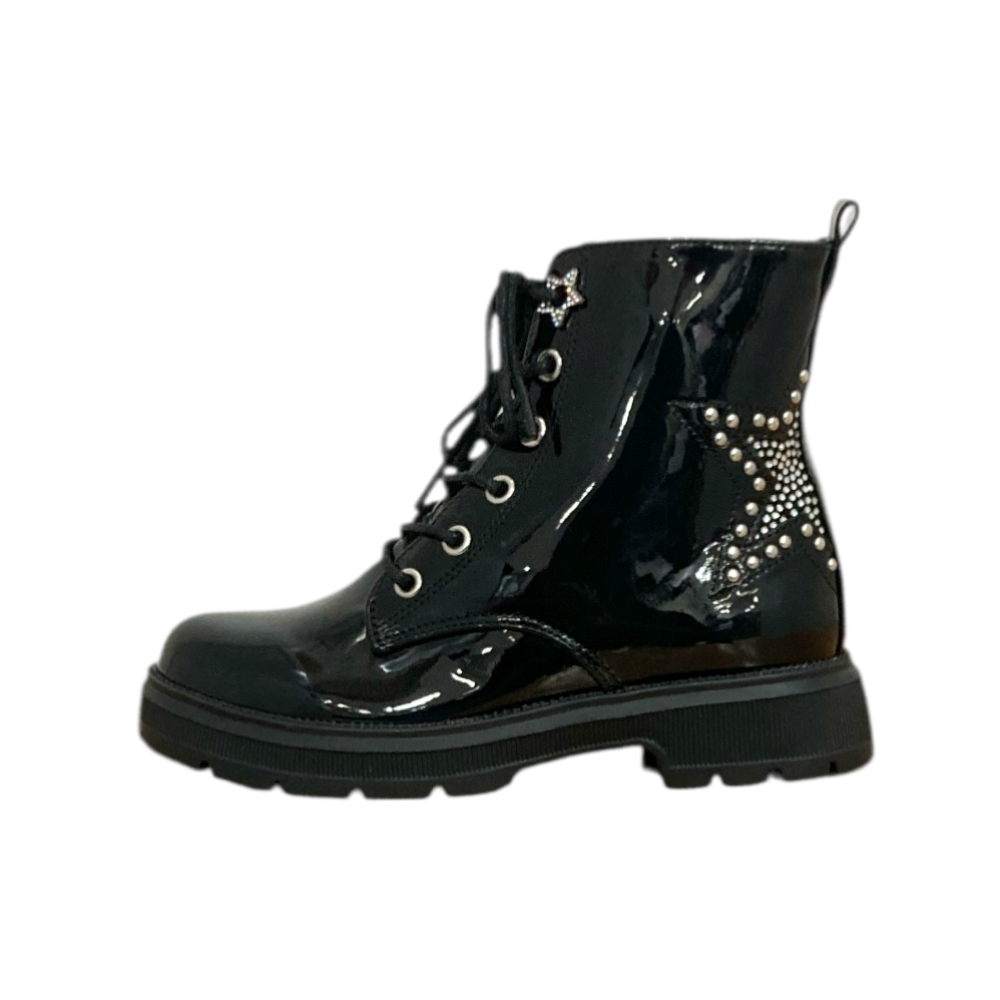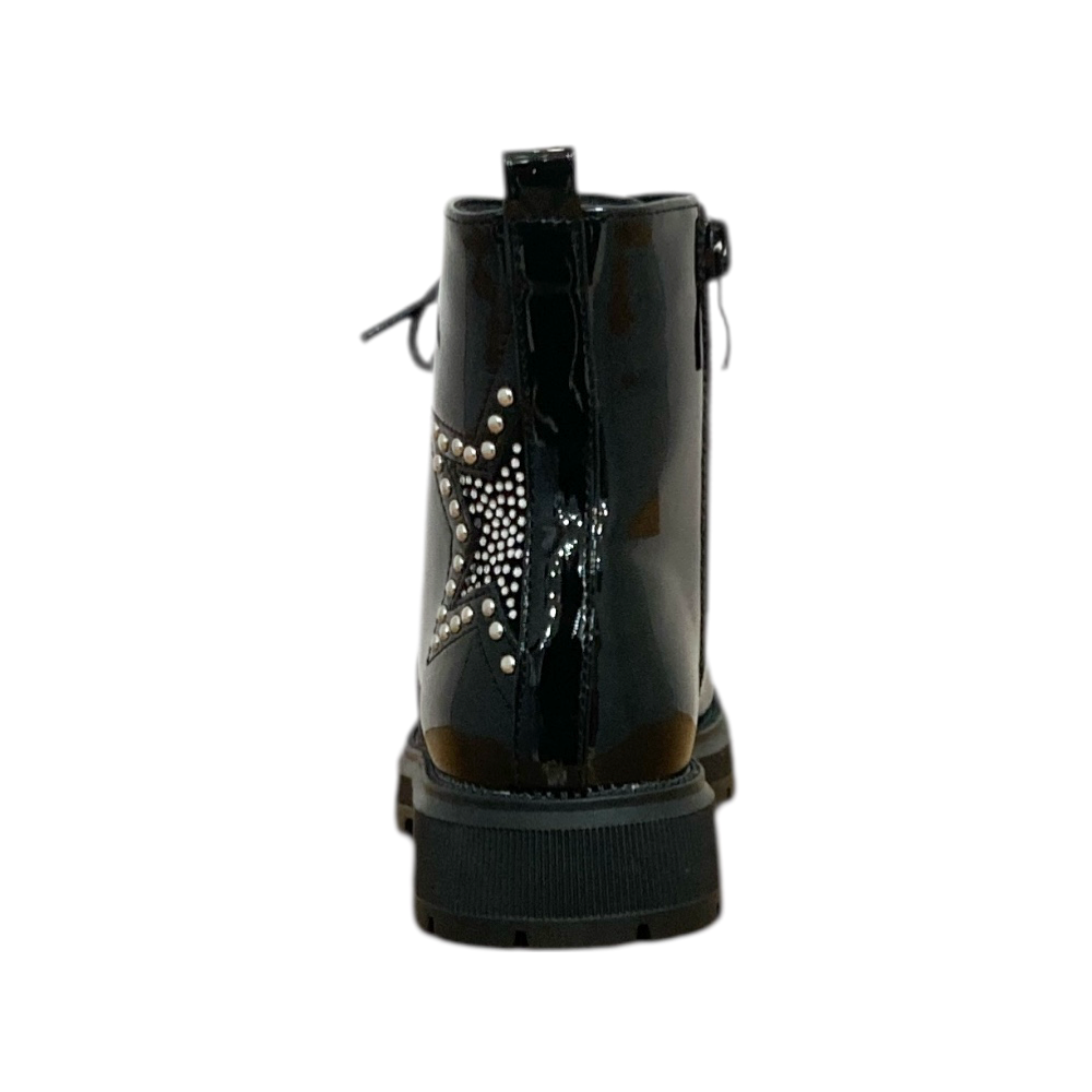 stivaletti bambina in eco-pelle lucida, con borchie e brillantini, chiusura con lacci e zip laterale, suola in gomma morbida, ref. A1012