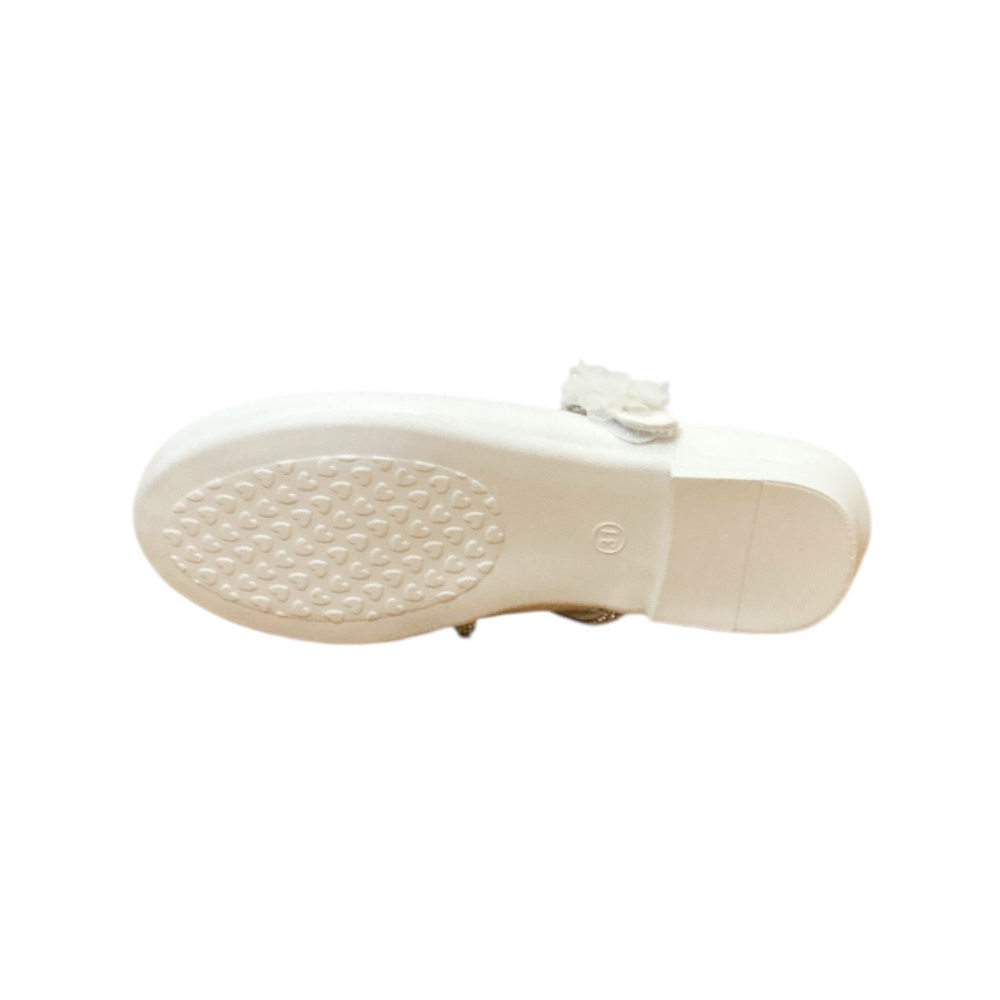 ballerina bambina in ecopelle, con doppia fascetta con brillantini e petali, chiusura con strappo, suola in gomma morbida, ref. 1070