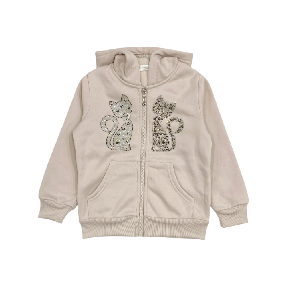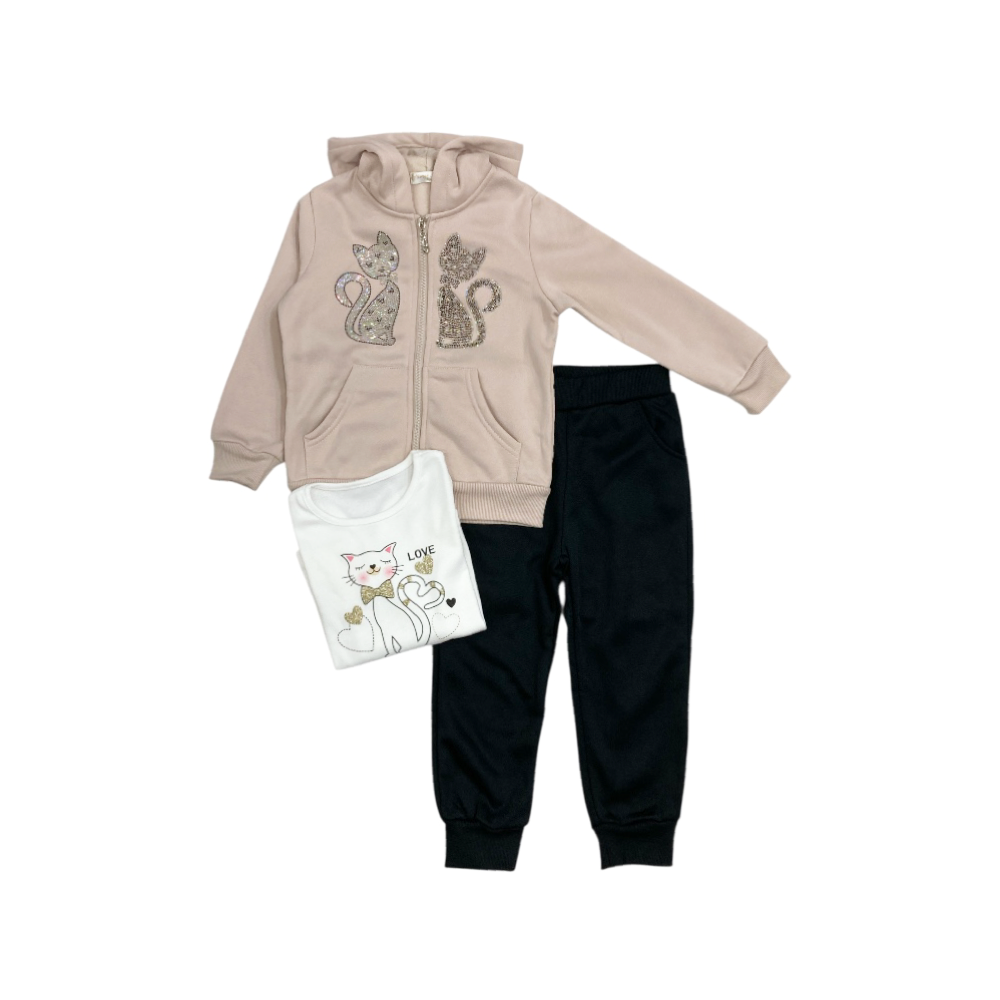 tuta bambina 3 pezzi in felpa invernale, giacca full zip con cappuccio brillantini al petto e tasche marsupio, t-shirt in caldo cotone coordinata con stampa sul davanti, panta tuta con tasche frontali e polsini agli orli, ref. SR1049
