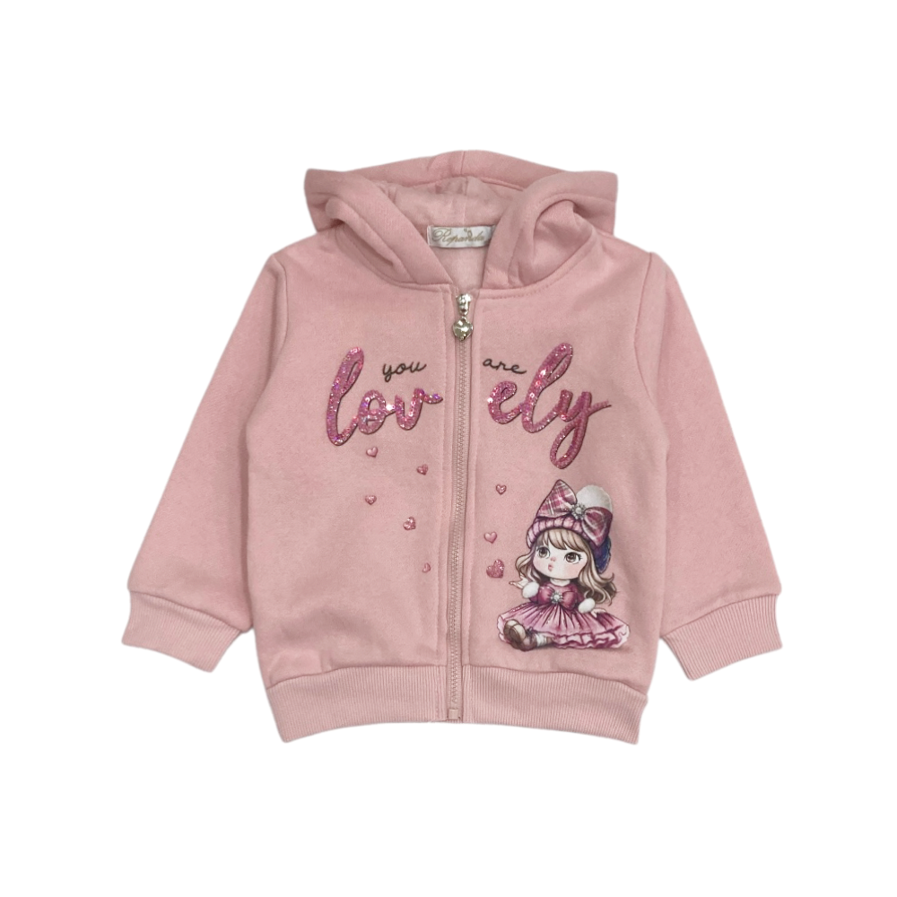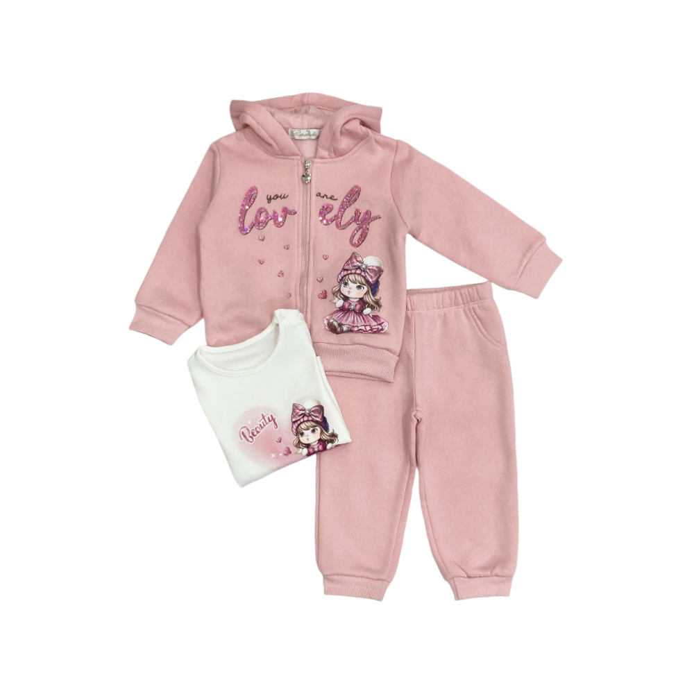 tuta jogging bambina 3 pezzi in felpa invernale, giacca full zip con cappuccio stampa e paillettes sul davanti, t-shirt in caldo cotone coordinata, panta-tuta con finte tasche frontali e polsini agli orli, ref. RW-2724