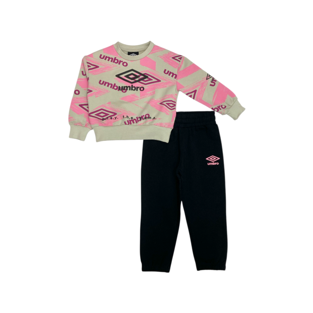 tuta jogging bambina in felpa stretch invernale, girocollo con stampa logo all over, panta-tuta con coulisse in vita e elastici agli orli, ref. T0019