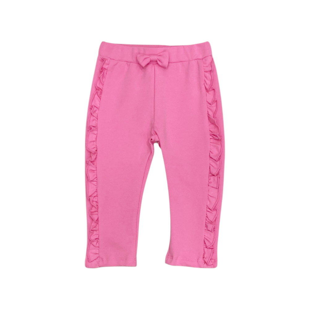tuta jogging bambina in felpa leggera, girocollo con apertura sul retro con 2 bottoncini, stampa oersetta sul davanti e rouches alle spalle, panta-tuta modello leggins con con rouches ai lati e fiocchetto applicato, ref. B-671