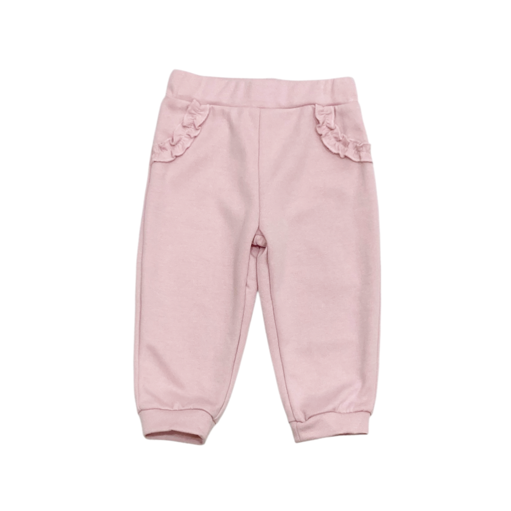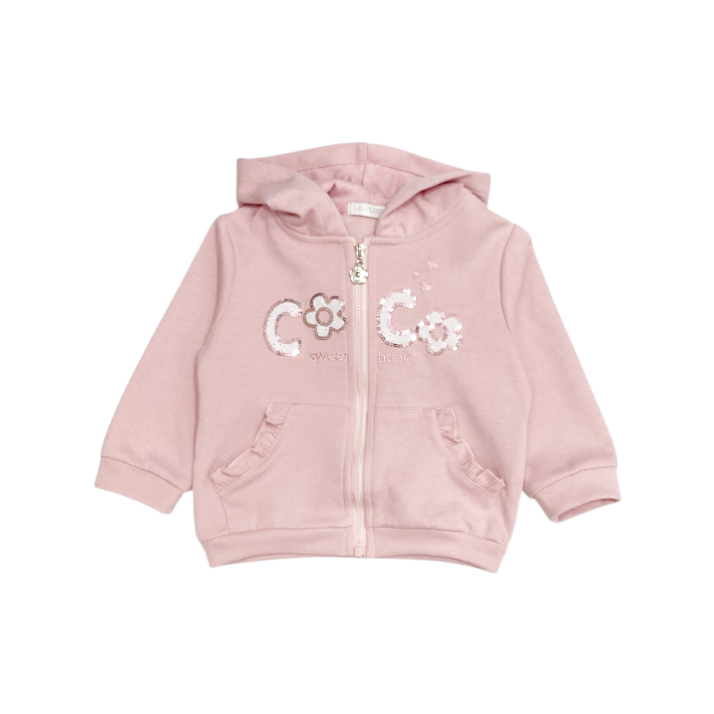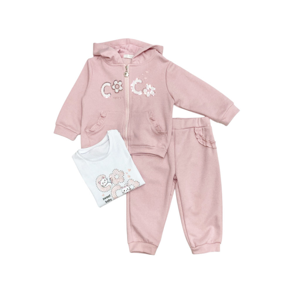 tuta jogging bambina 3 pezzi in felpa leggera, giacca full zip con cappuccio, tasche marsupio con rouches e ricamo con paillettes al petto, t-shirt in jersey coordinata con stampa sul davanti, panta-tuta con finte tasche con rouches e polsini agli orli, ref. B-309