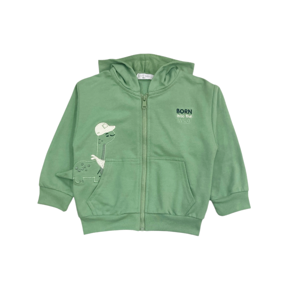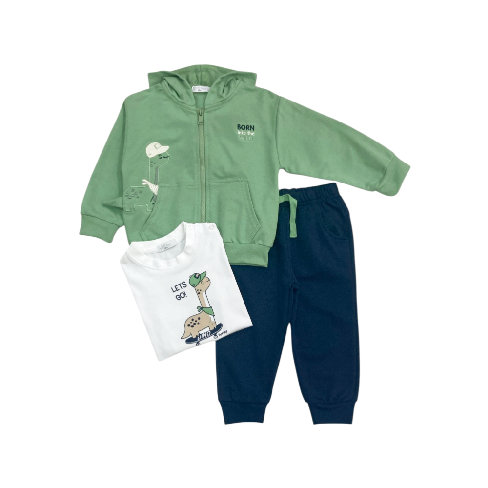tuta jogging 3 pezzi in felpa leggera, full zip con cappuccio tasche marsupio e ricamo sul davanti, t-shirt coordinata con stampa "DINO", panta-tuta con finta coulisse in vita tasche frontali e polsini agli orli, ref. 5513