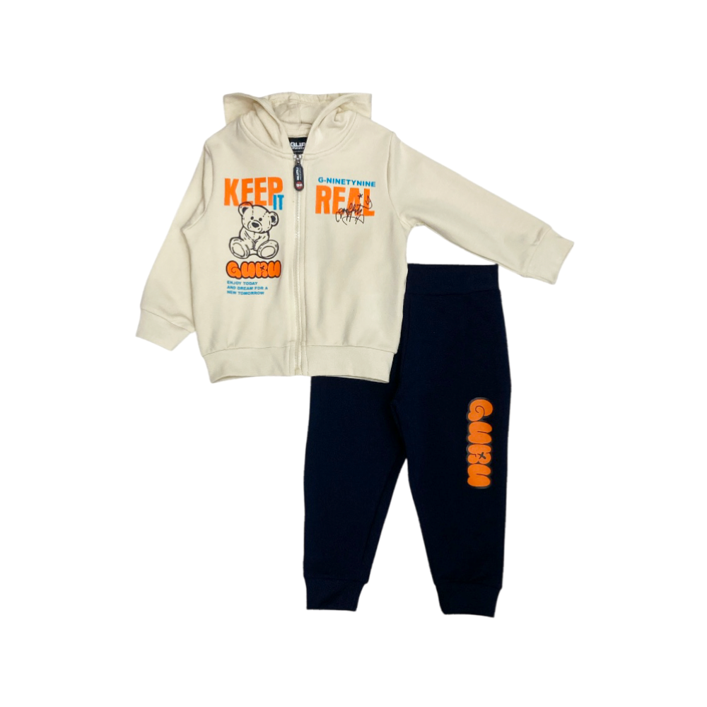 tuta jogging bambino in felpa leggera, full zip con cappuccio e stampa logo, panta-tuta con coulisse in vita tasca posteriore e polsini agli orli, ref. T0008