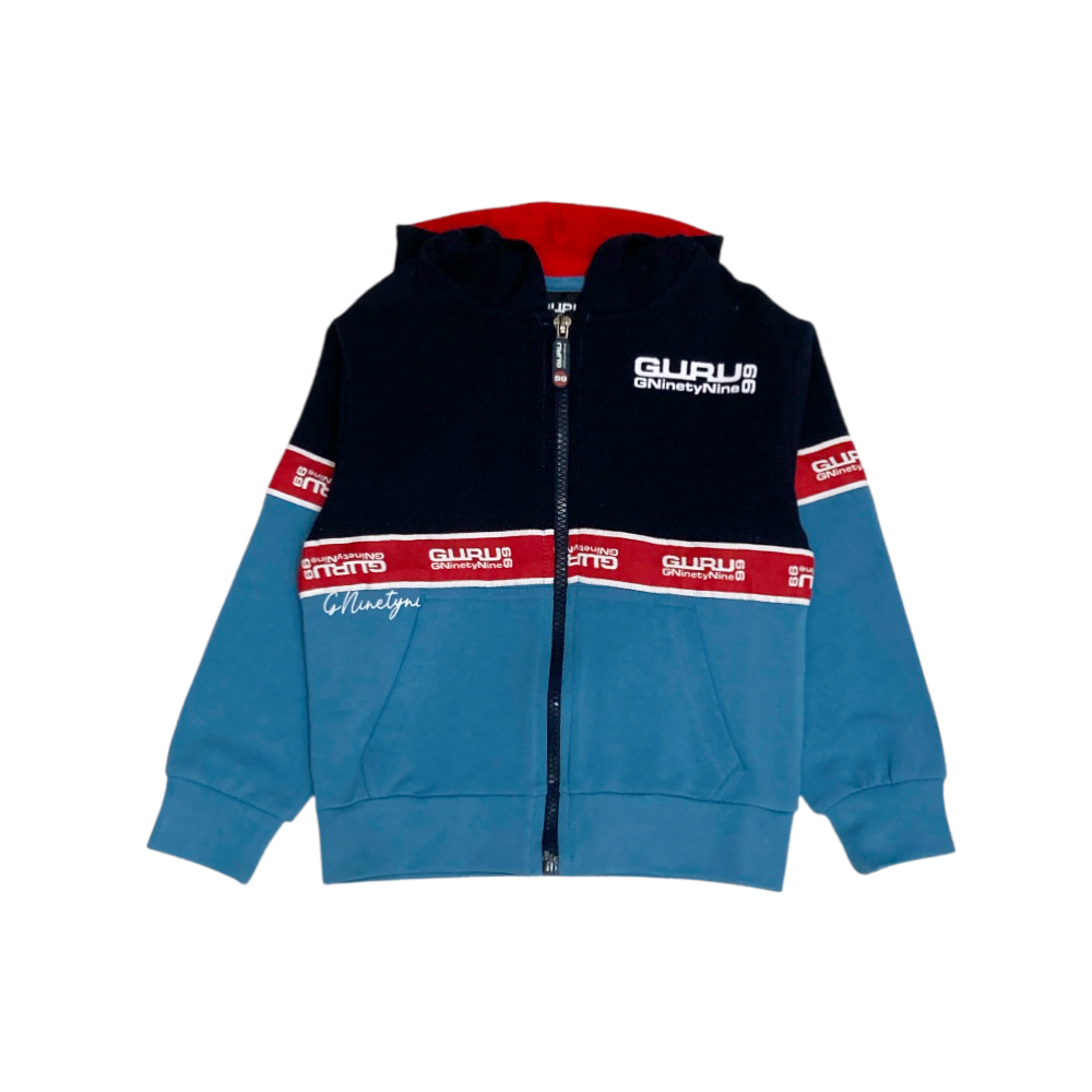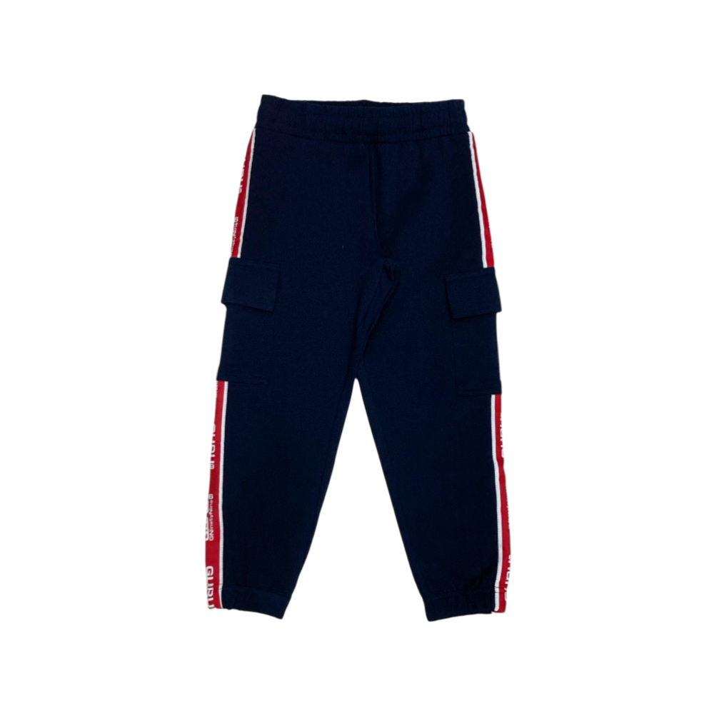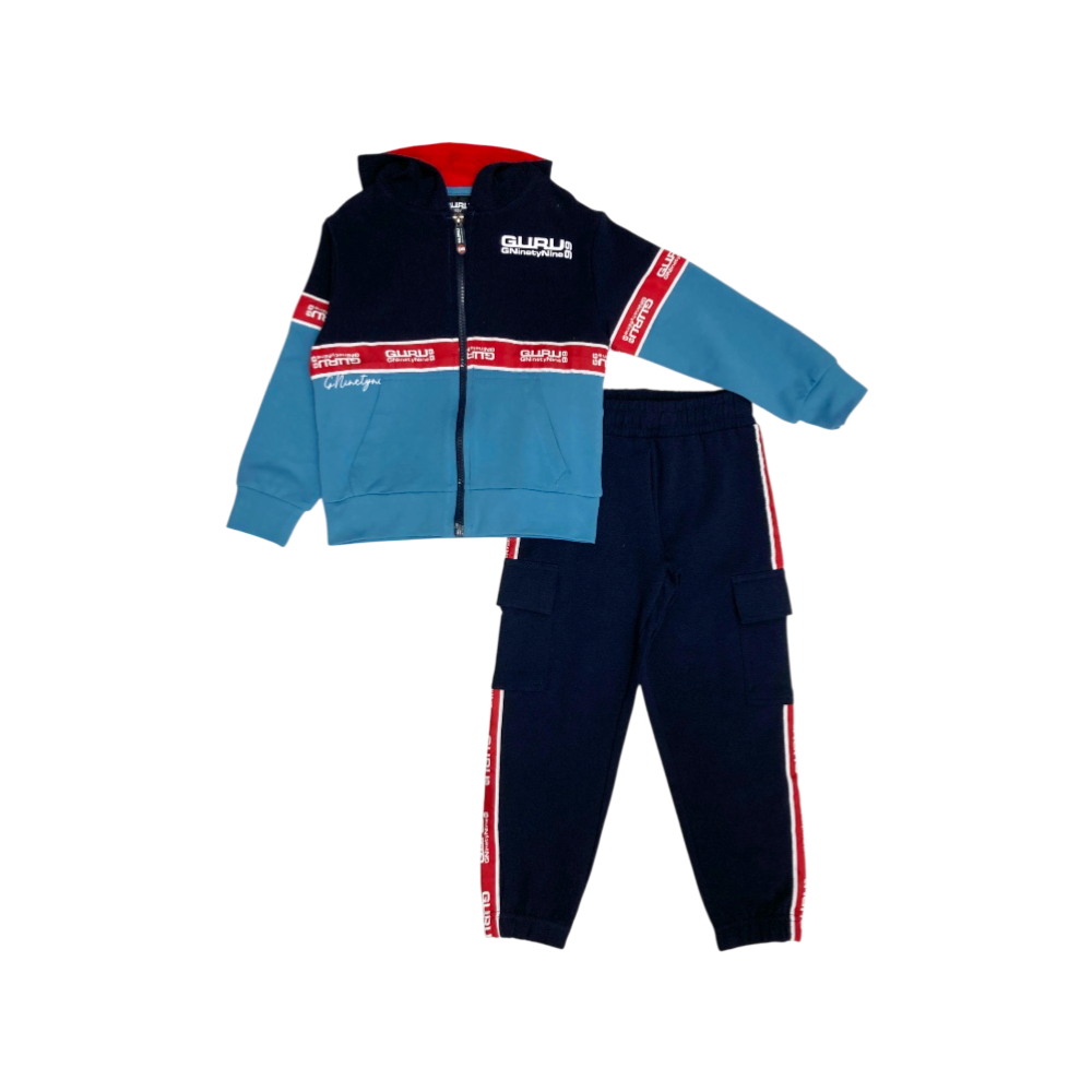 tuta jogging bambino in felpa leggera, full zip con cappuccio, stampa logo e passamaneria logata, tasche marsupio, panta-tuta modello cargo con coulisse in vita passamaneria e elastici agli orli, ref. T0016