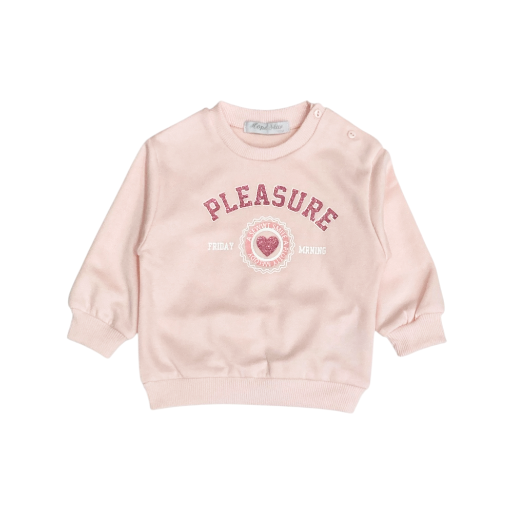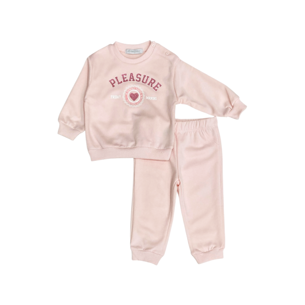 tuta jogging bambina in felpa leggera, girocollo con stampa suò davanti, apertura sulla spalla solo nelle tg. 12-18-24 mesi, panta-tuta con finta tasche anteriori e polsini agli orli, ref. BK1018