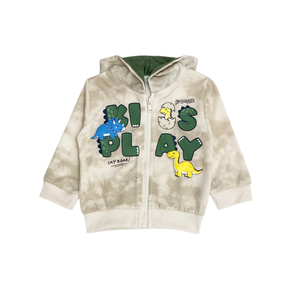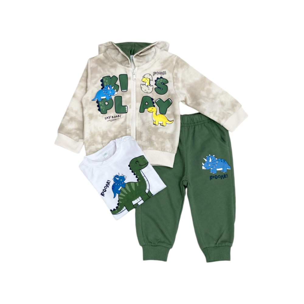 tuta jogging 3 pezzi in felpa leggera, giacca effetto vintage full zip con cappuccio e stampa DINO sul davanti, t-shirt maniche corte in jersey con stampa coordinata, panta-tuta con tasche frontali e polsini agli orli, ref. JA-2622