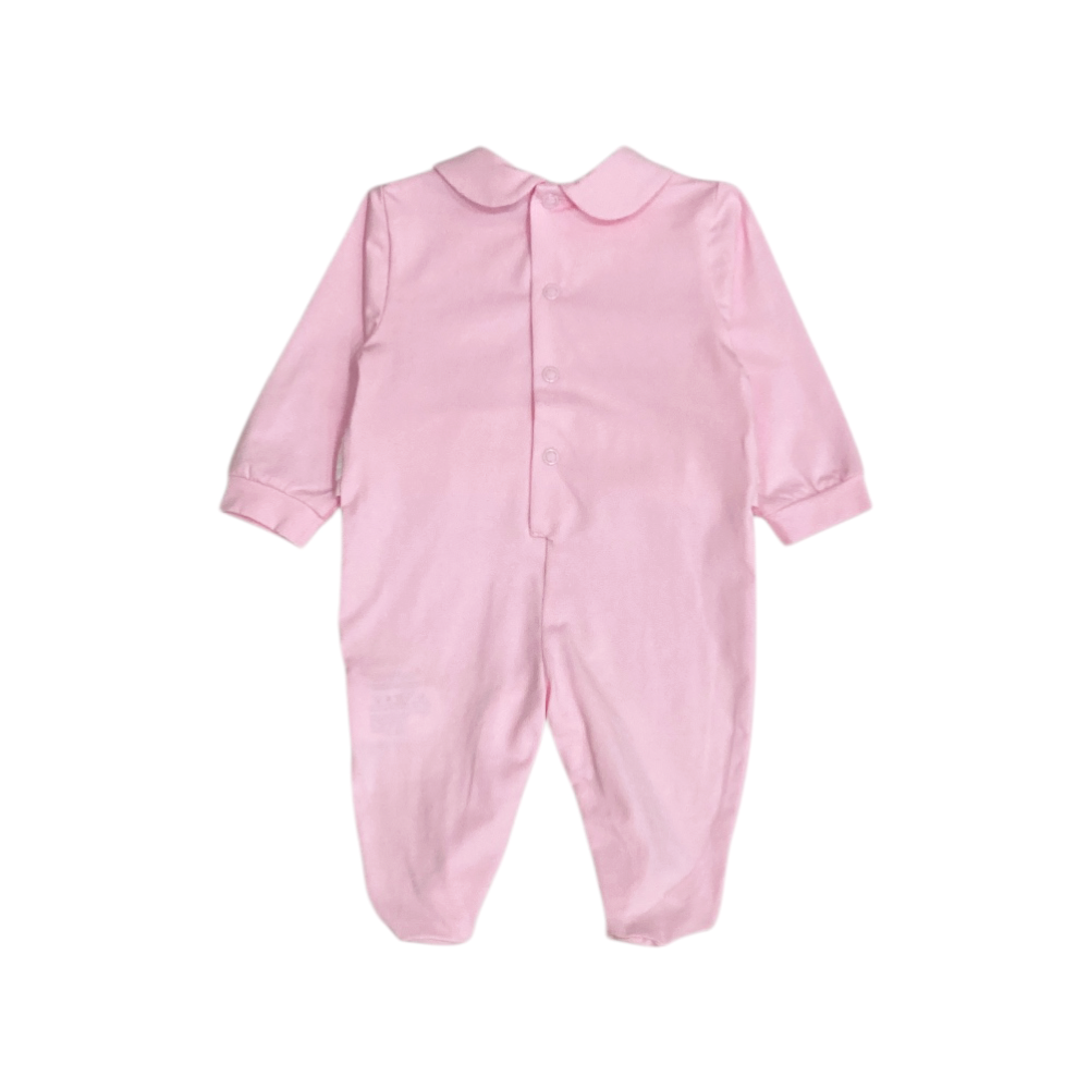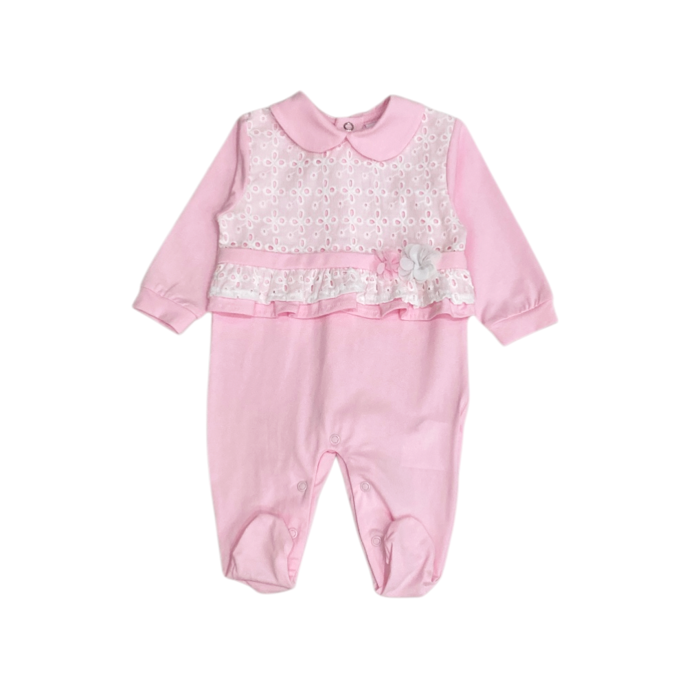 tutina intera con piedini in cotone jersey, con colletto top in san gallo e petali applicati, ref. TJ040
