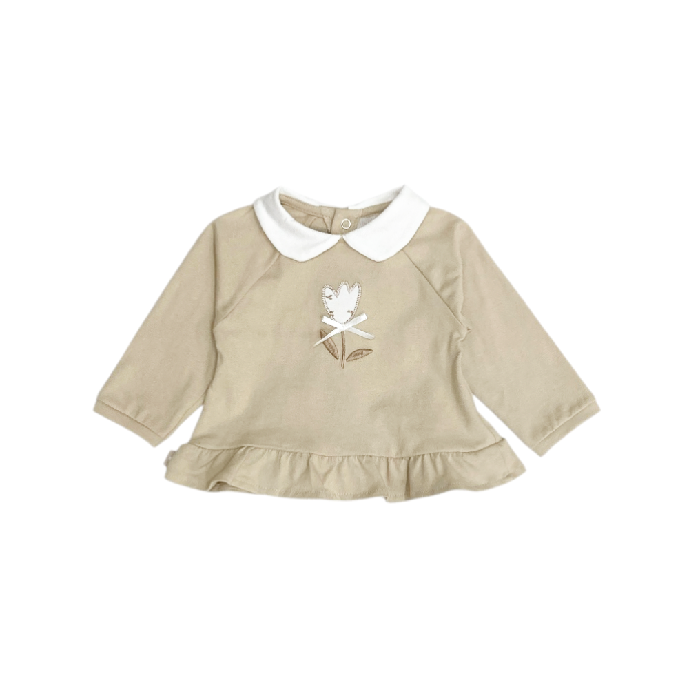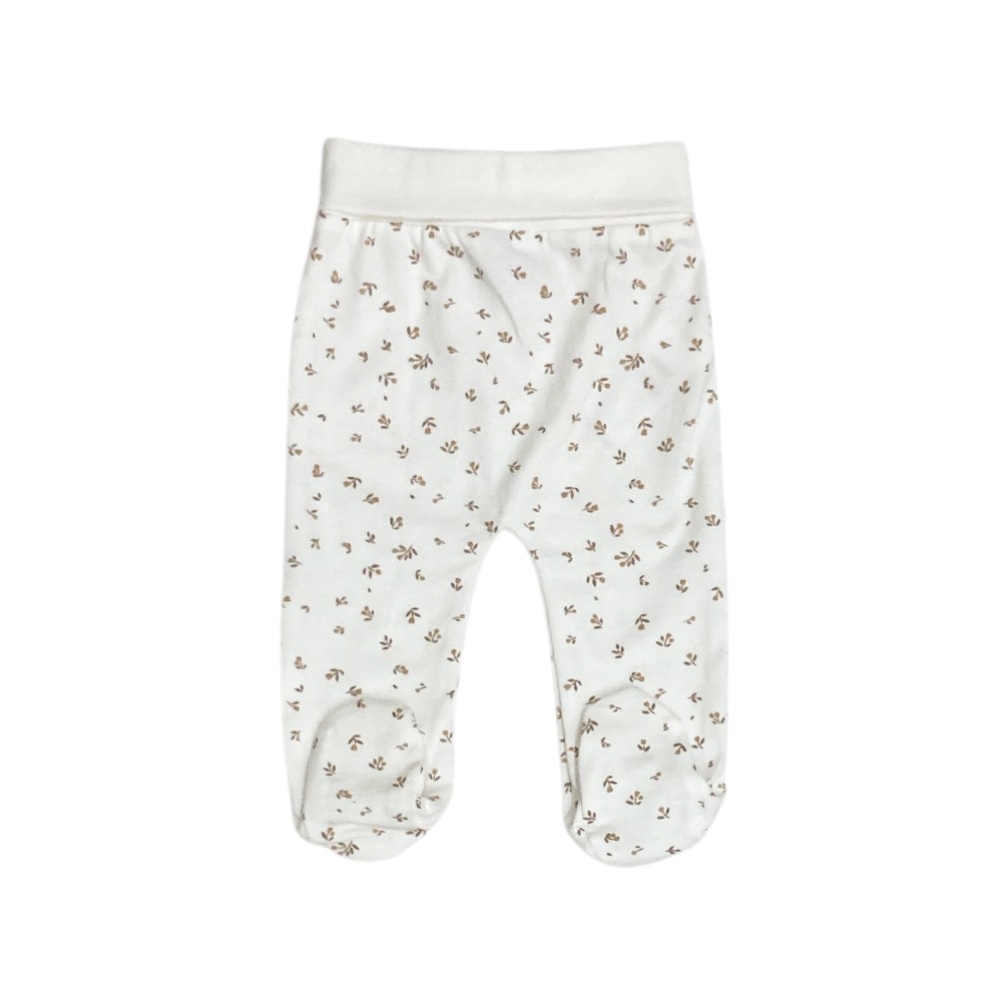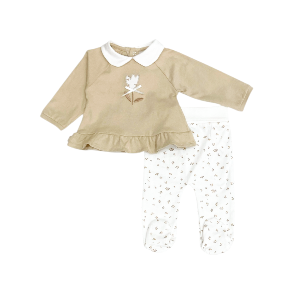 clinico neonata con piedini in cotone jersey, con colletto ricamino sul davanti e volant al bordo, apertura sul ratro, ghetta fantasia fiorellini, ref. 160401